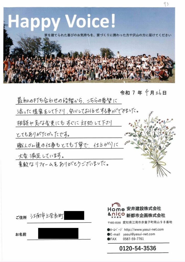 最初の打合せの段階から、こちらの要望に添った提案をして下さり、安心してお任せする事ができました。相談や急な変更にもすぐに対処して下さりとてもありがたかったです。職人さん達の仕事もとても丁寧で、仕上がりに大変満足しています。素敵なリフォームをありがとうございました。