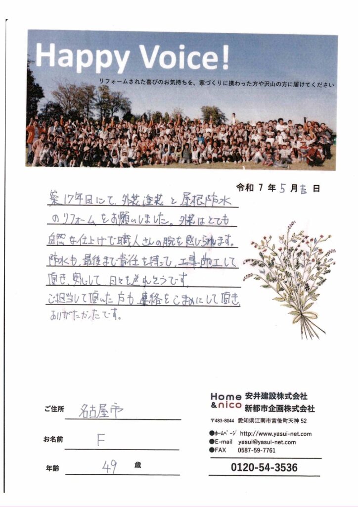 築17年目にて、外装塗装と屋根防水のリフォームをお願いしました。外装はとても自然な仕上げで職人さんの腕を感じられます。防水も最後まで責任を持って工事施工して頂き、安心して日々を送れそうです。ご担当して頂いた方も、連絡をこまめにして頂きありがたかったです。