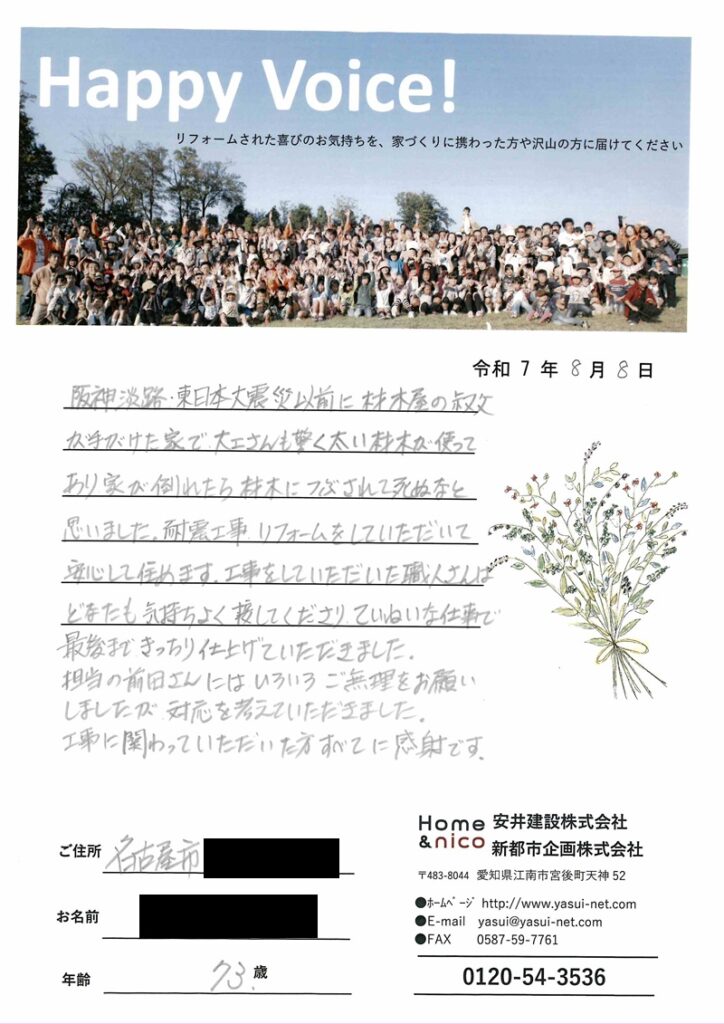 阪神淡路・東日本大震災以前に材木屋の叔父が手がけた家で、大工さんも驚く太い材木が使ってあり家が倒れたら材木につぶされて死ぬなと思いました。耐震工事リフォームをしていただいて安心して住めます。工事をしていただいた職人さんはどなたも気持ちよく接してくださり、ていねいな仕事で最後まできっちり仕上げていただきました。担当の前田さんにはいろいろご無理をお願いしましたが対応を考えていただきました。工事に関わっていただいた方すべてに感謝です。