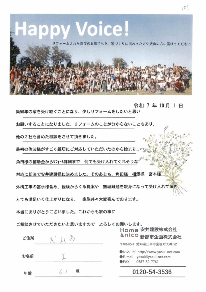 築50年の家を受け継ぐことになり、少しリフォームをしたいと思いお願いすることになりました。リフォームのことが分からないこともあり、他の2社も含めた相談をさせて頂きました。最初の佐波様がすごく親切にご対応していただいたのから始まり、角田様の補助金からリフォーム詳細まで、何でも受け入れてくれそうな対応に即決で安井建設様に決めました。そのあとも、角田様、相澤様、宮本様、外構工事の富永様を含め、経験からくる提案や無理難題を親身になって受け入れて頂き、とても満足いく仕上がりになり、家族共々大変喜んでおります。本当にありがとうございました。これからも家の事にご相談させていただきたいと思いますのでよろしくお願いします。