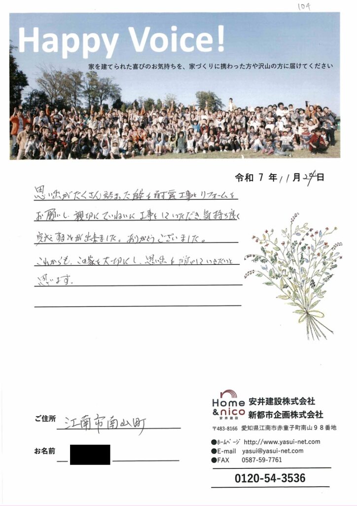 思い出がたくさん詰まった自宅を耐震工事とリフォームをお願いし、親切にていねいに工事をしていただき気持ち良く完成することが出来ました。ありがとうございました。これからも、この家を大切にし、思い出を増やしていきたいと思います。