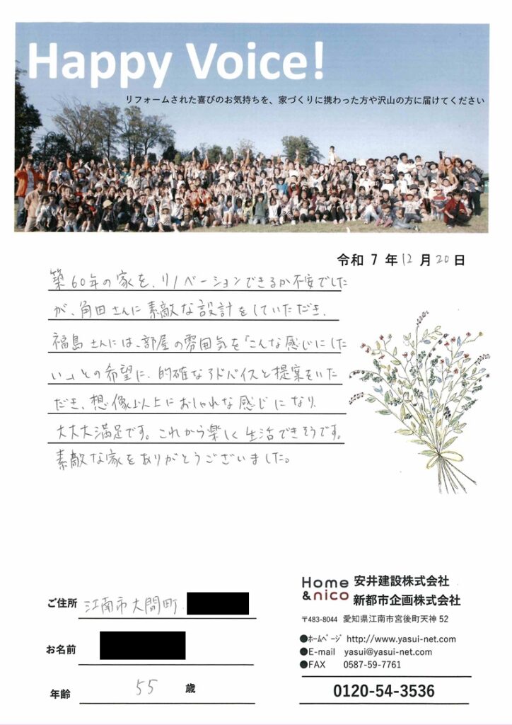 築60年の家を、リノベーションできるか不安でしたが、角田さんに素敵な設計をしていただき、福島さんには部屋の雰囲気を「こんな感じにしたい」との希望に、的確なアドバイスと提案をいただき、想像以上におしゃれな感じになり、大大大満足です。これから楽しく生活できそうです。素敵な家をありがとうございました。