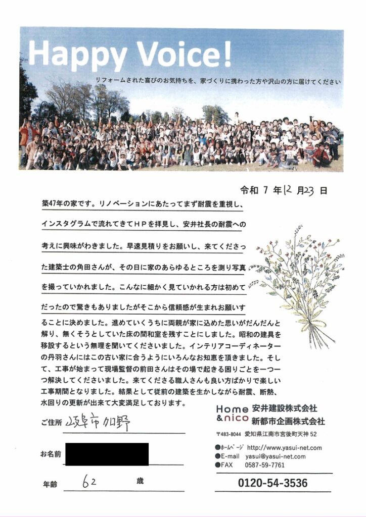 築47年の家です。リノベーションにあたってまず耐震を重視し、インスタグラムで流れてきたHPを拝見し、安井社長の耐震への考えに興味がわきました。早速見積りをお願いし、来てくださった建築士の角田さんが、その日に家のあらゆるところを測り写真を撮っていかれました。こんなに細かく見ていかれる方は初めてだったので驚きもありましたがそこから信頼感が生まれお願いすることに決めました。進めていくうちに両親が家に込めた思いがだんだんと解り、無くそうとしていた床の間和室を残すことにしました。昭和の建具を移設するという無理を聞いてくださいました。インテリアコーディネーターの丹羽さんにはこの古い家に合うようにいろんなお知恵を頂きました。そして、工事が始まって現場監督の前田さんはその場で起きる困りごとを一つ一つ解決してくださいました。来てくださる職人さんも良い方ばかりで楽しい工事期間となりました。結果として従前の建築を生かしながら耐震、断熱、水回りの更新が出来て大変満足しております。