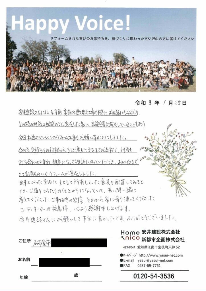 安井建設さんには4年前実家の建て替え工事の際にお世話になっており、その時の対応は勿論のこと完成した家に家族全員大満足していることもあり、今回私達のマンションのリフォーム工事もお願いすることにしました。今回も見積りの段階から引き渡しに至るまでの過程で、何度も打合せを重ね、親身になって相談にのっていただき、おかげさまでとても満足のいくリフォームが完成しました。出来上がった室内にもともと所有していた家具を配置してみると、イメージ通りぴったりの仕上がりになっていて、長い間一緒に考えてくださった工事担当の皆様、それから常に寄り添ってくださったコーディネーターの福島様、心より感謝申し上げます。安井建設さんにお願いして本当に良かったです。ありがとうございました。